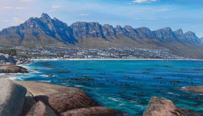 A3 limited edition (80), signed and numbered Andrew Cooper print of his Maidens Cove to Camps Bay painting.